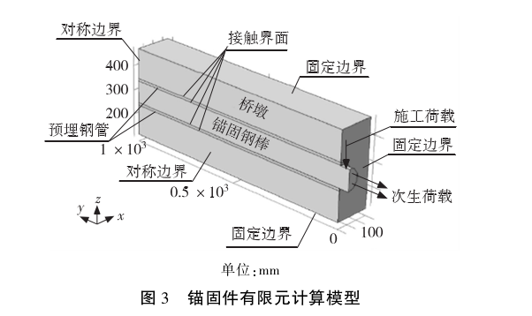采用三维有限元建立桥梁模板桥墩和钢梢棒等锚固件的实体几何模型,鉴于桥梁模板桥墩自身设计荷载远高于盖梁浇筑期间的施工荷载,可认为桥梁模板桥墩整体发生破坏的可能性很小,仅可能出现锚固件周围的局部破坏,因此为简化计算,仅基于对称原则建立锚固件周围长度、宽度和高度分别为1 000 mm ,150 mm和300 mm范围内的几何模型,采用对称界面实现模型的对半映像,忽略同一不落地支架相邻两锚固件的相互影响。考虑到桥梁模板桥墩内密集配筋产生的强约束条件,模型的底面、顶面和外侧面均采用固定边界条件,内侧面和背侧面采用对称边界,外侧面采用自由边界。钢梢棒与预埋钢管之间采用法向硬接触和切向光滑的接触界面模拟,抗压不抗拉;预埋钢管与桥梁模板桥墩混凝土之间采用粘附接触界面。钢梢棒外露端顶部施加垂向的施工荷载,模拟牛腿腹板与钢梢棒的接触应力;外露截面施加纵向的次生施工荷载钢梢棒拉力,计算见2. 3节。几何模型如图3所示。www.qlmb.net